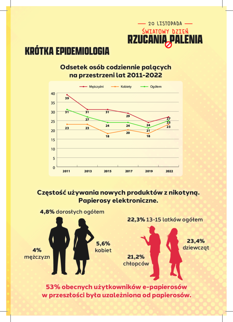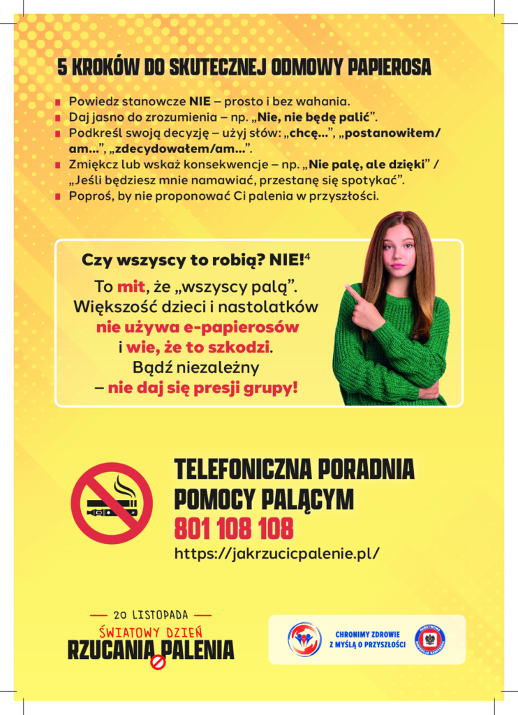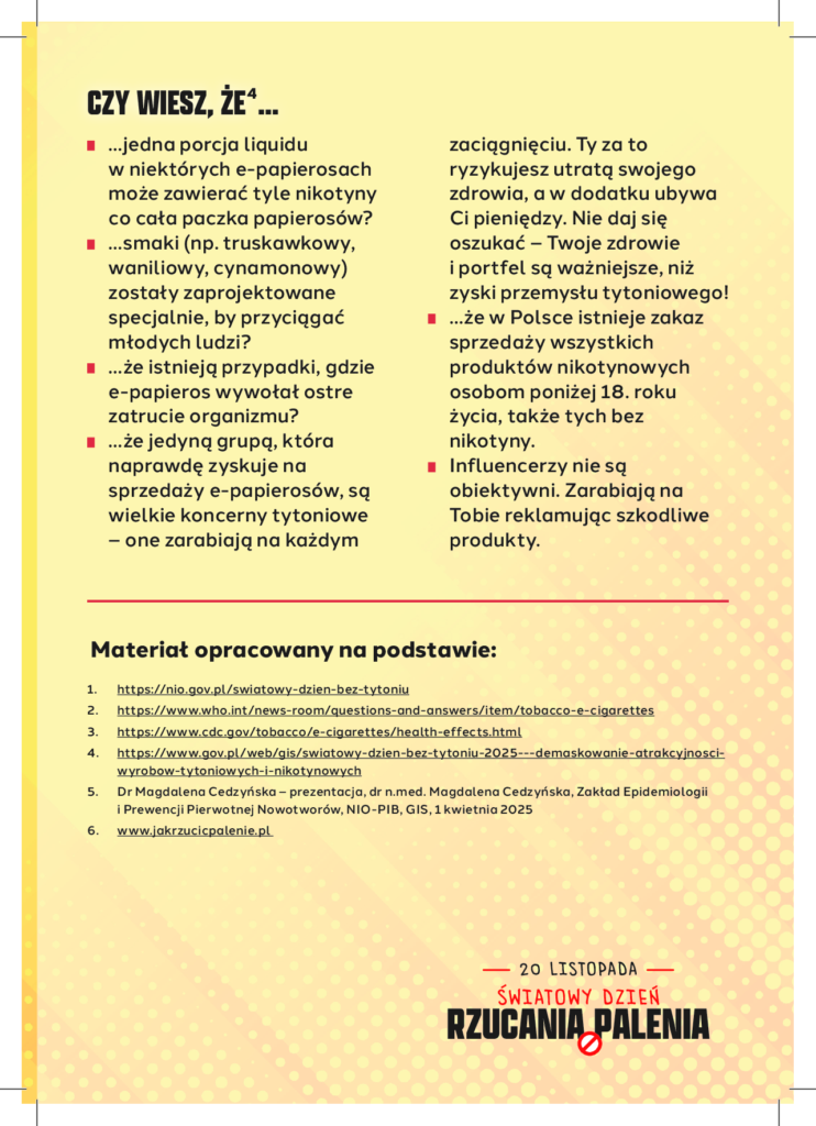 W 2025 roku Światowy Dzień Rzucania Palenia Tytoniu przypada na 20 listopada 2025 ( czwartek) Na całym świecie tytoń zabija ponad 5 milionów osób każdego roku – w tym ponad 600 tysięcy osób, które palą biernie. Bierne palenie jest szczególnie niebezpieczne dla niemowląt i małych dzieci, których układ oddechowy wciąż się rozwija a mechanizmy odpornościowe dopiero „uczą się” jak prawidłowo bronić organizm. Nie istnieje żaden bezpieczny czas, w którym dziecko może być wystawione na oddziaływanie biernego palenia, dlatego należy zawsze zrezygnować z nałogu, w przypadku posiadania lub planowania dziecka. Papieros zawiera ok. 7000 szkodliwych dla zdrowia związków, a 70 z nich jest przyczyną zachorowań na nowotwory. Oprócz nowotworów istnieje szereg groźnych konsekwencji palenia: miażdżyca, zawał, udar mózgu, , astma.